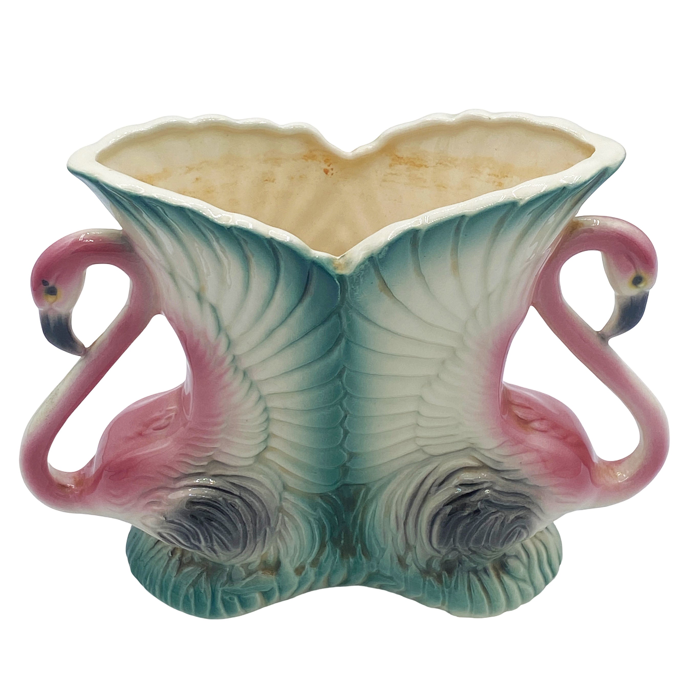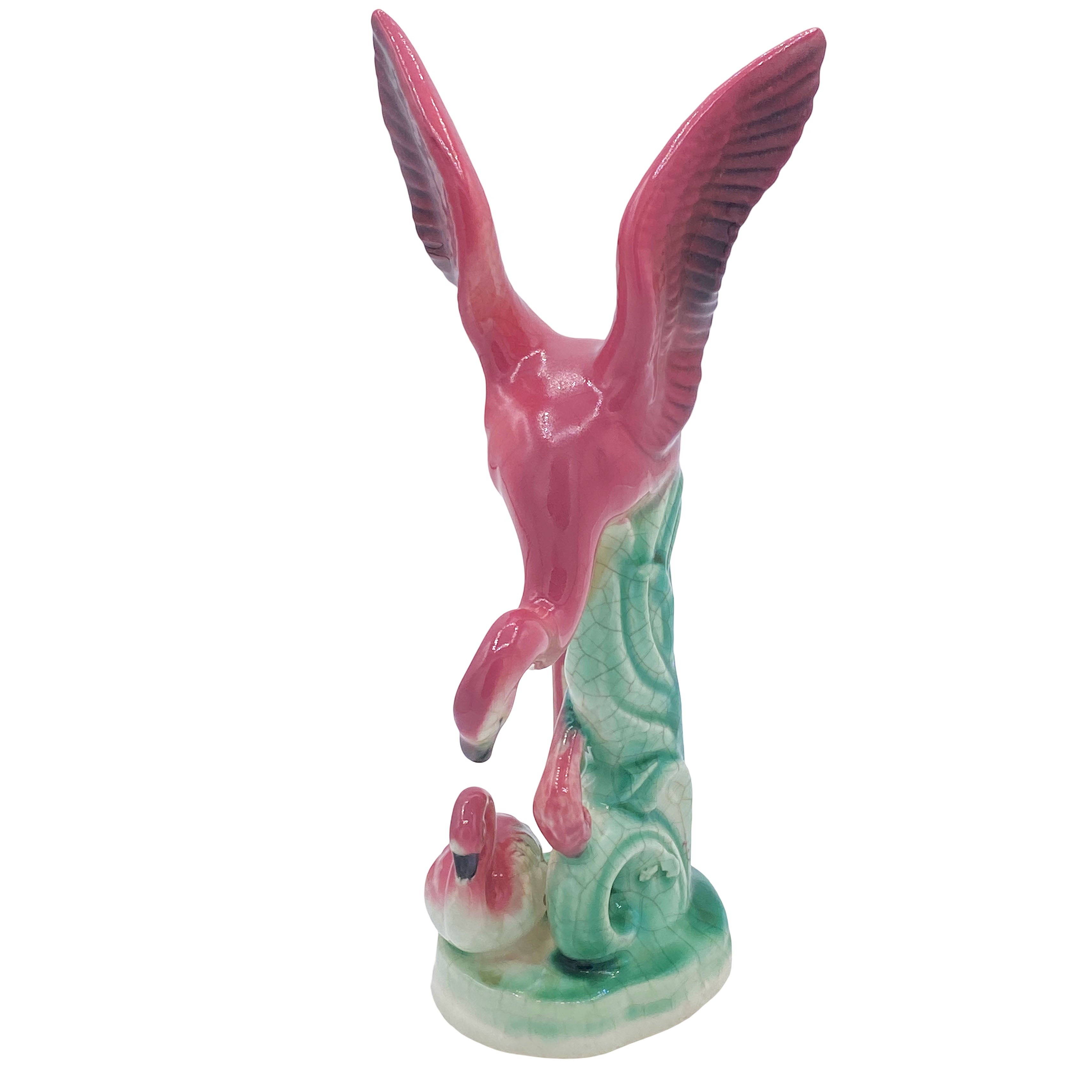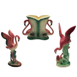 Mid-century set of 2 pink and green flamingo ceramic figurines and decorative vase. The set features two beautifully detailed pink flamingos with their wings outstretched among lush green leaves, and a matching pool tray with a pink color and grassy borders.  The vase features 2 Flamingos with stretched-out wings forming the front of the vase.  Each comes with a gloss finish that highlights the rich pinks, greens, and gold accents, making it a striking statement piece.