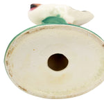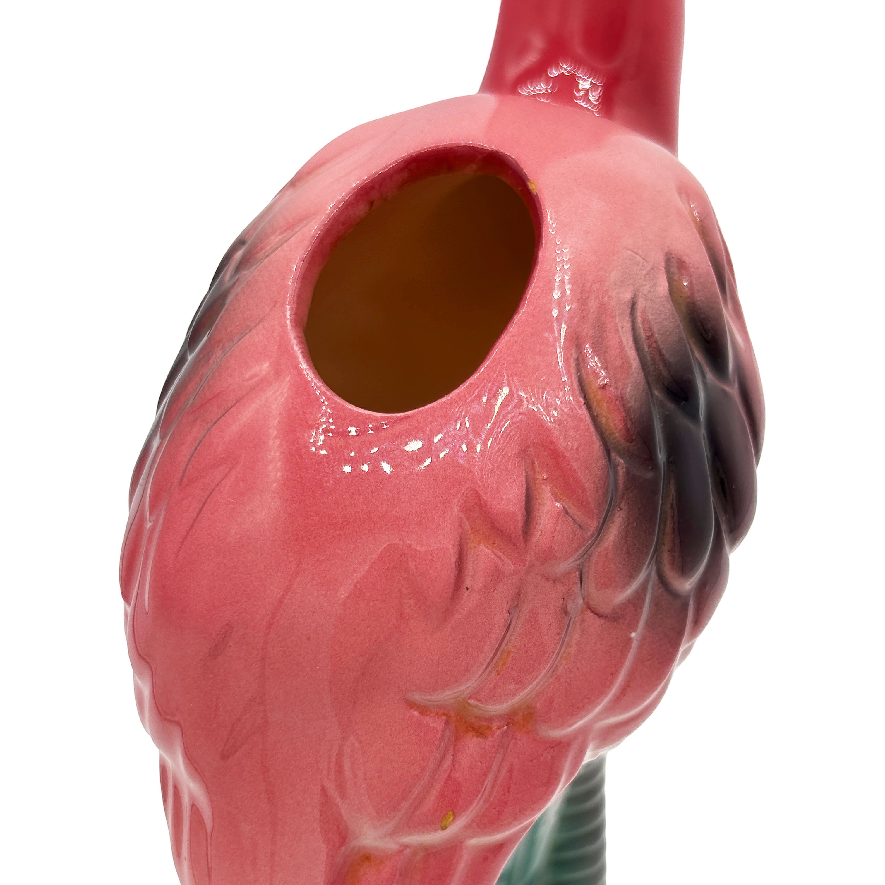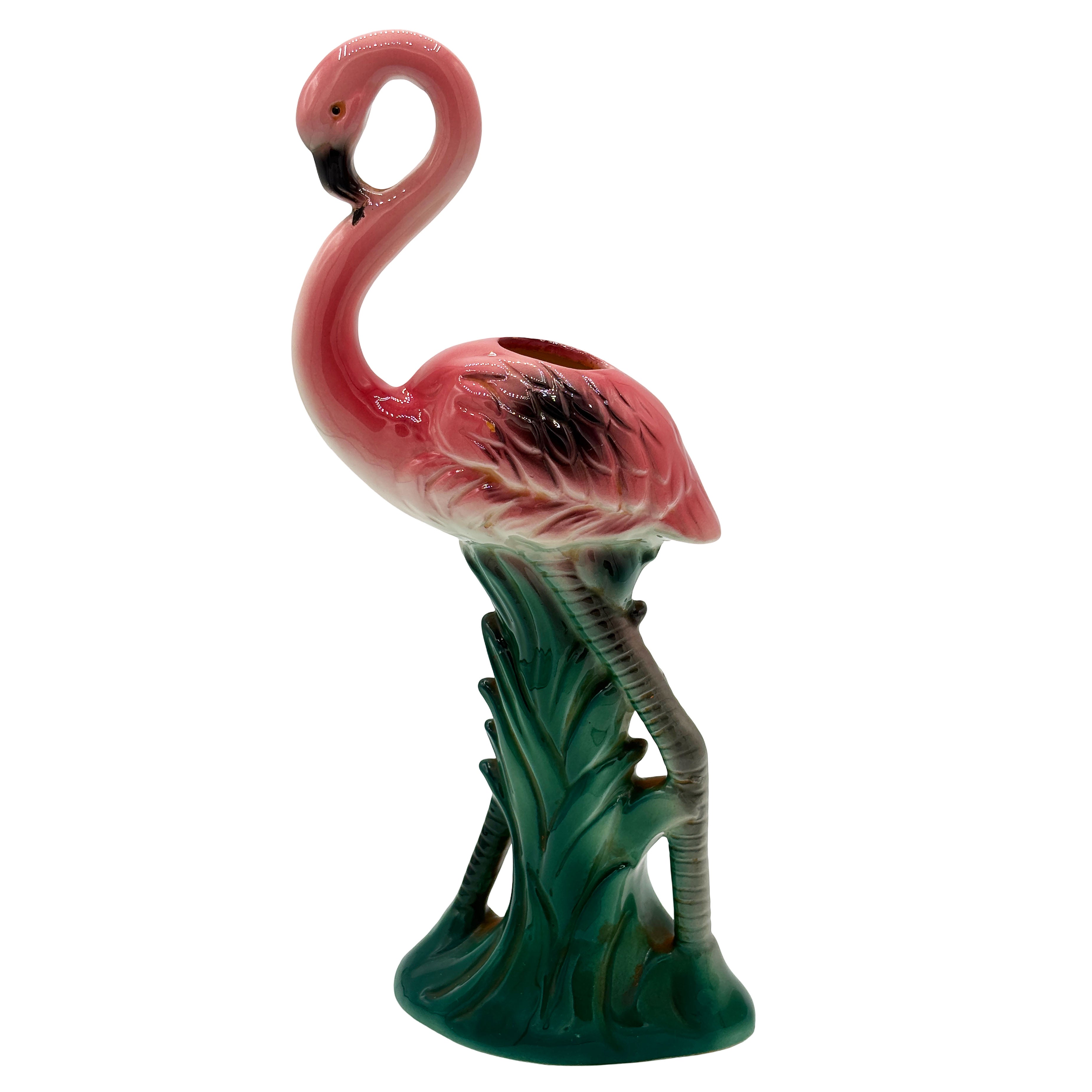 Mid-century set of 2 pink and green flamingo ceramic figurines with flamingo pool tray decorative bowl. The set features two beautifully detailed pink flamingos with their wings outstretched among lush green leaves, and a matching pool tray with a pink color and grassy borders. Each comes with a gloss finish that highlights the rich pinks, greens, and gold accents, making it a striking statement piece.