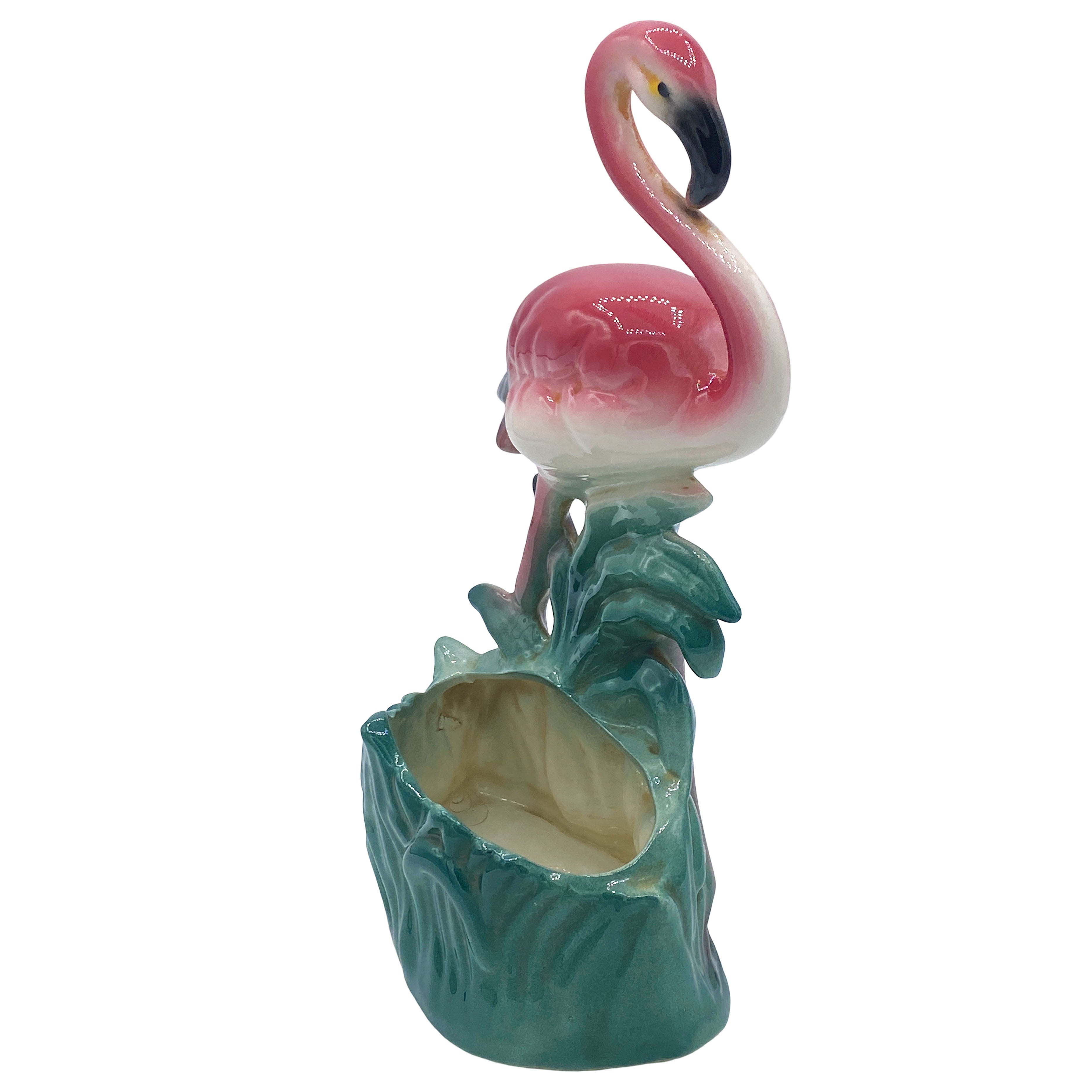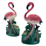 Mid-century pink and green "Lovers" ceramic flamingo tabletop California planter, matching His and Her set. The set features two beautifully detailed pink flamingos in lush green leaves and grass with a pink color. Each comes with a gloss finish that highlights the rich pinks, greens, and gold accents, making it a striking statement piece.